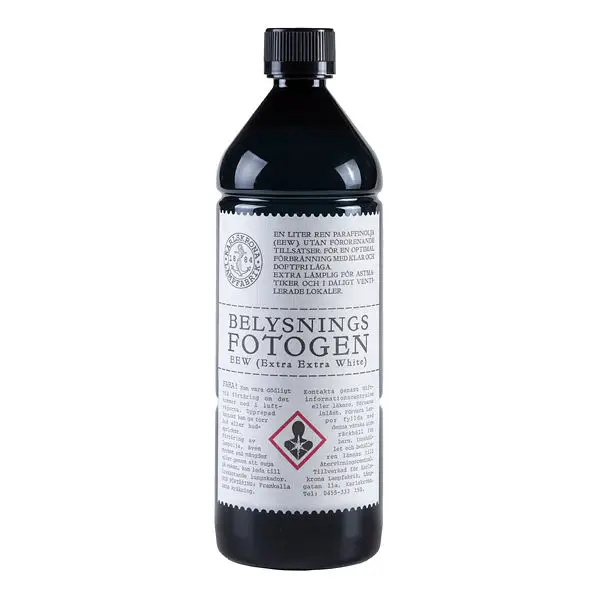 En liter extra ren (EEW, extra extra white) paraffinolja utan förorenande tillsatser för en klar och doftfri låga. Lampolja för fotogenlampor och -lyktor. Enligt tillverkaren även användarvänlig för doftkänsliga eller astmatiker, tack vara den ytterst lilla mängd doft som frigörs. Från Karlskrona Lampfabrik.