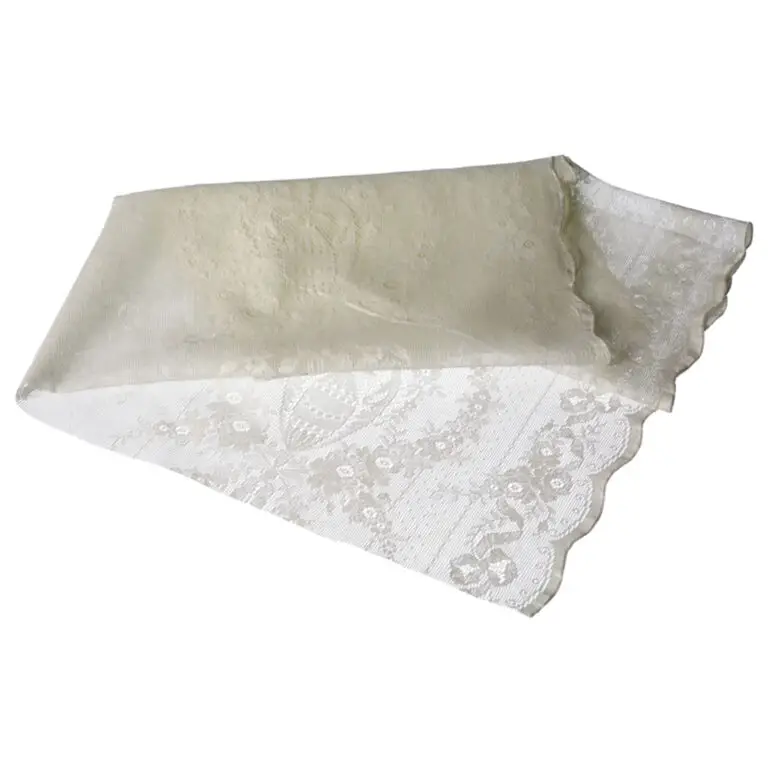 Spets- eller trådgardiner var en mycket vanlig importvara i Sverige från det sena 1800-talet fram till andra världskriget. Många mönster, liksom detta, vävdes i Skottland, där det fortfarande finns en stark och levande tradition för mönstrade gardiner av riktig bomull. Denna gardin vävs fortfarande på gamla vävstolar i ett av de få kvarvarande väverierna. Gardinen är av finaste elfenbensvit bomull och praktfullt mönstrad med rosor i vaser, girlanger, band och bårder. Ett tidstypisk överdådigt 1800-talsmönster, lämpligt till husets finaste rum.