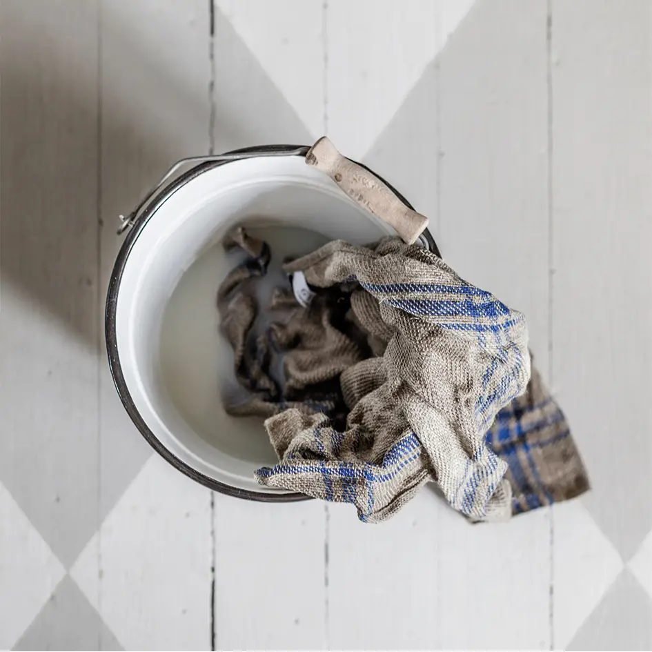 Högabsorberande trasa i hellinne. Linet torkar snabbare än bomull och syntet och man slipper den typiskt sura skurtrasedoften. Trasan är vävd av oblekt linnegarn i kypertteknik, en vävteknik som ger en lösare och följsammare trasa än moderna. Oblekt lin suger dessutom fukt betydligt bättre än blekt lin. Trasan har en rejäl påsydd hälla, som gör att den lätt kan hängas upp på krok efter användningarna.