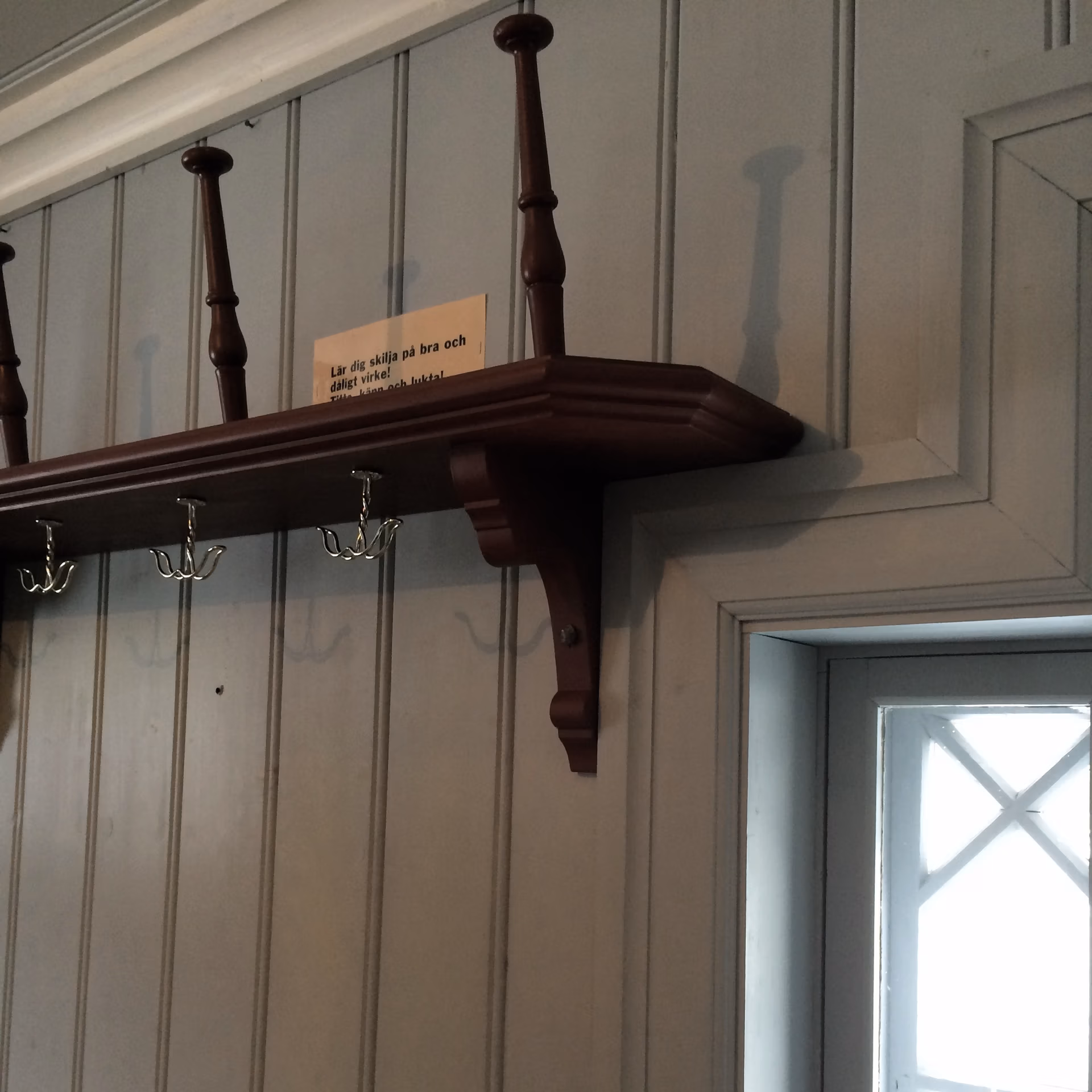 Hatthylla efter modell från 1910-talet. Fasade hörn. Profilhyvlade kanter. Hyllplan och konsoler av furu. Hattpinnar svarvade av björk.