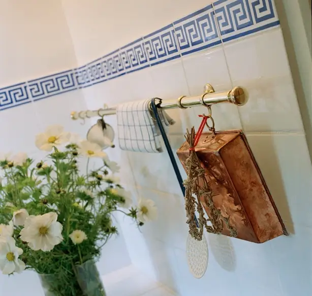 Stång att fästa ovanför köksspisen för köksredskap, grytlappar mm. Kan också användas som handdukshängare i kök, eller i badrum. Modellen var vanlig från sent 1800-tal fram till 1930-talet.