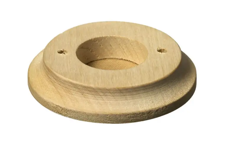Väggplatta för ringledningsknapp. Träplattan ger stadga åt elinstallationen och utgör samtidigt en dekorativ sockel till ringledningsknappen. Plattan är försedd med försänkta skruvhål och monteras med baksidans urfrästa kanal i lodrät riktning.