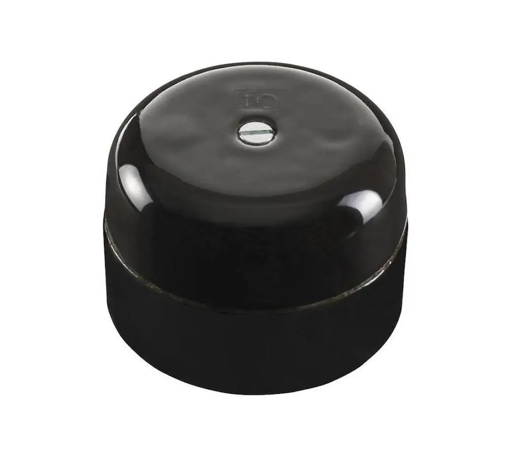 Slät, rund kulodosa i svart porslin för utanpåliggande montering. Nytillverkad efter traditionell modell.