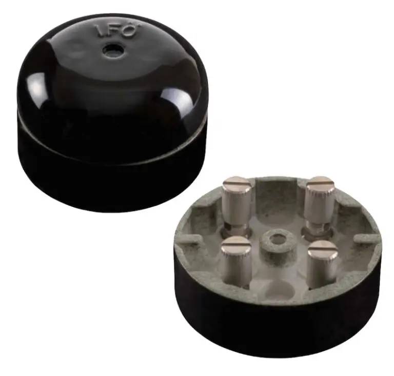 Slät, rund kulodosa i svart porslin för utanpåliggande montering. Nytillverkad efter traditionell modell.