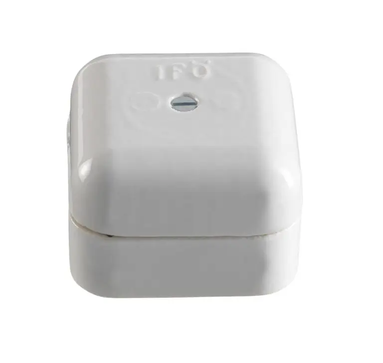 Kvadratisk kopplingsdosa i vitt porslin för utanpåliggande montering. Nytillverkad i klassisk modell.