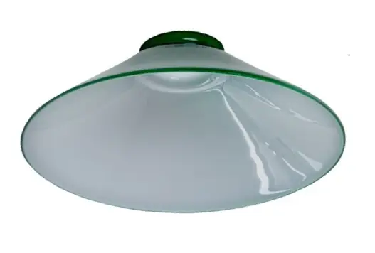 Handblåst, grön lampskärm i opalglas till skomakarlampor, hisslampor, vägglampor etc. Skärmen är djup och gör att glödlampan inte bländar, vilket är vanligt i flacka skärmar.