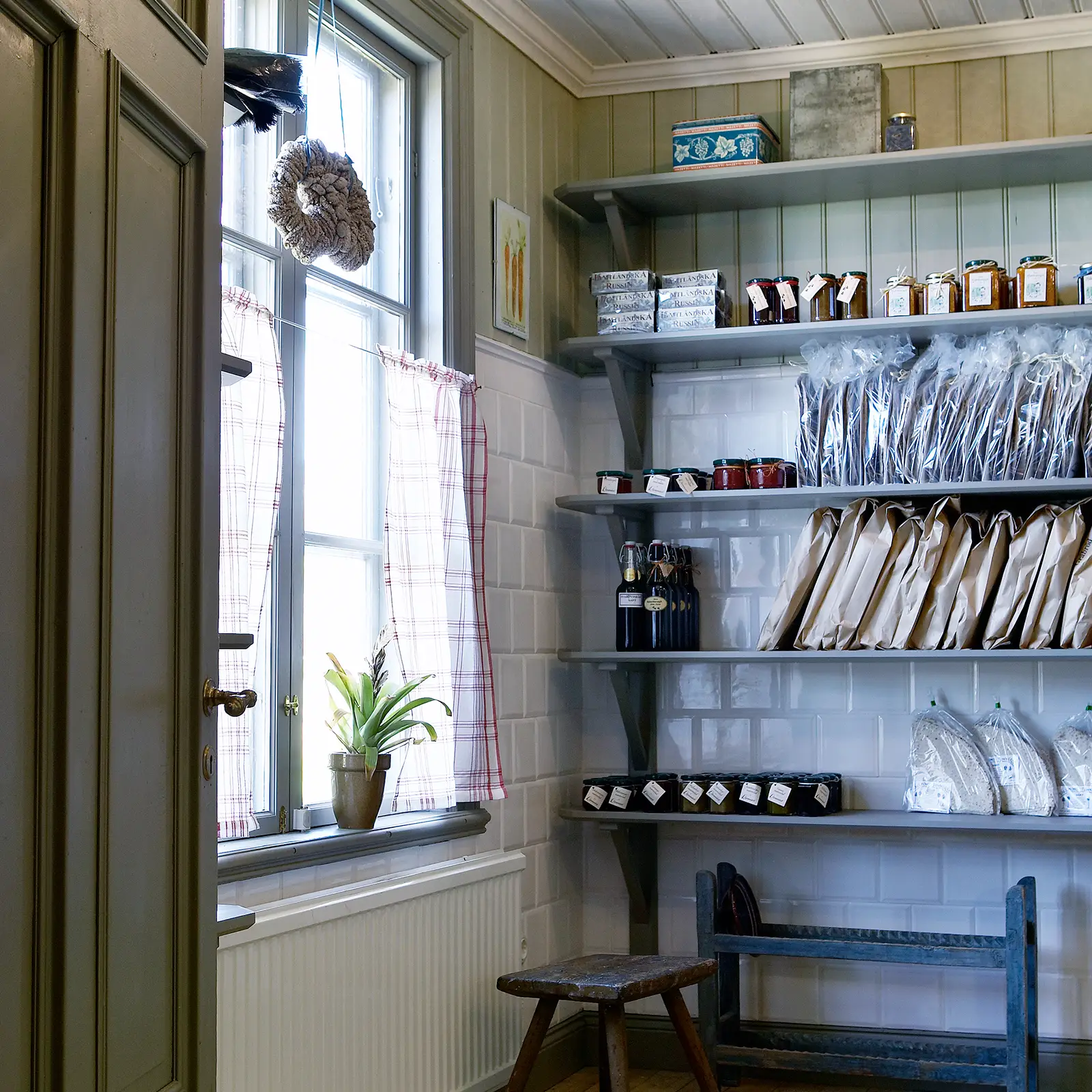 Välgjord hylla i tre plan efter modell från ett skafferi i Gävle från 1890-talet. Ett gott exempel på den omsorg som lades ner på snickeri även i den enklaste av bostadens utrymmen.