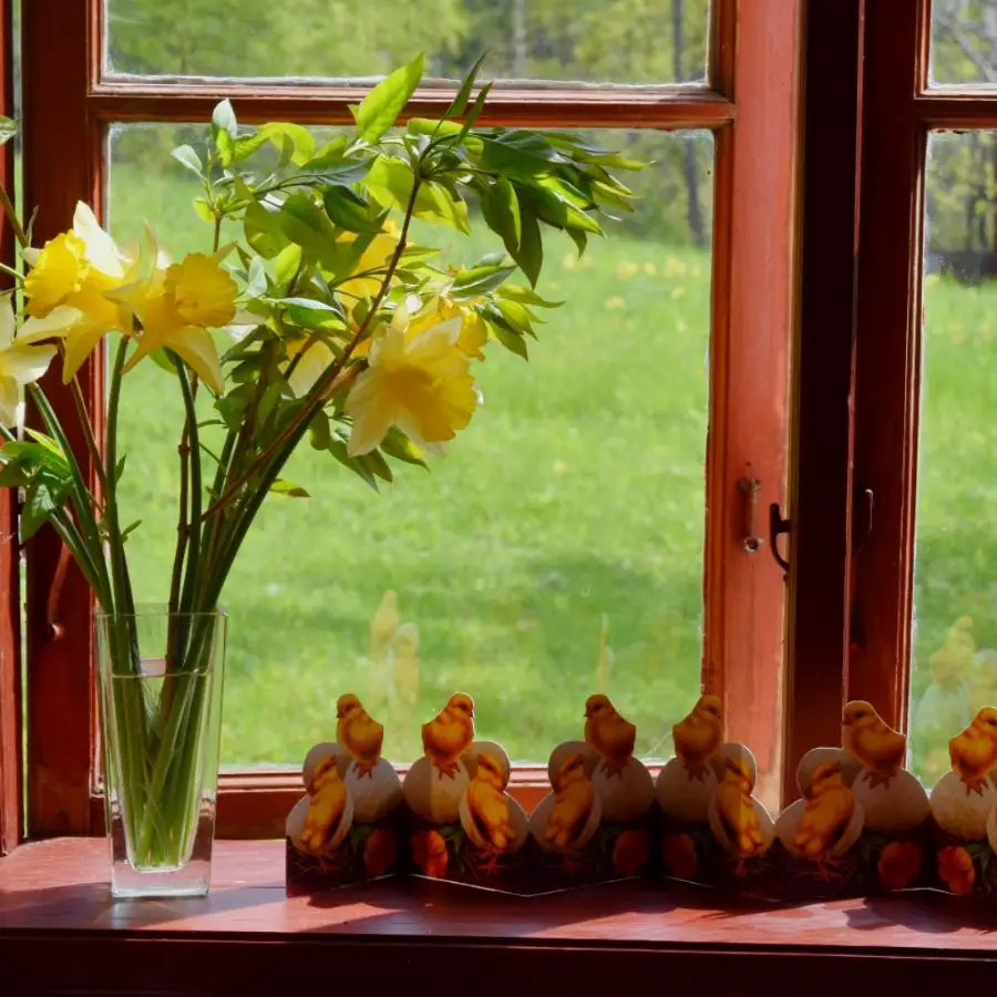 Gammeldags påskpynt i form av pappersrad med små kycklingar och ägg på rad.