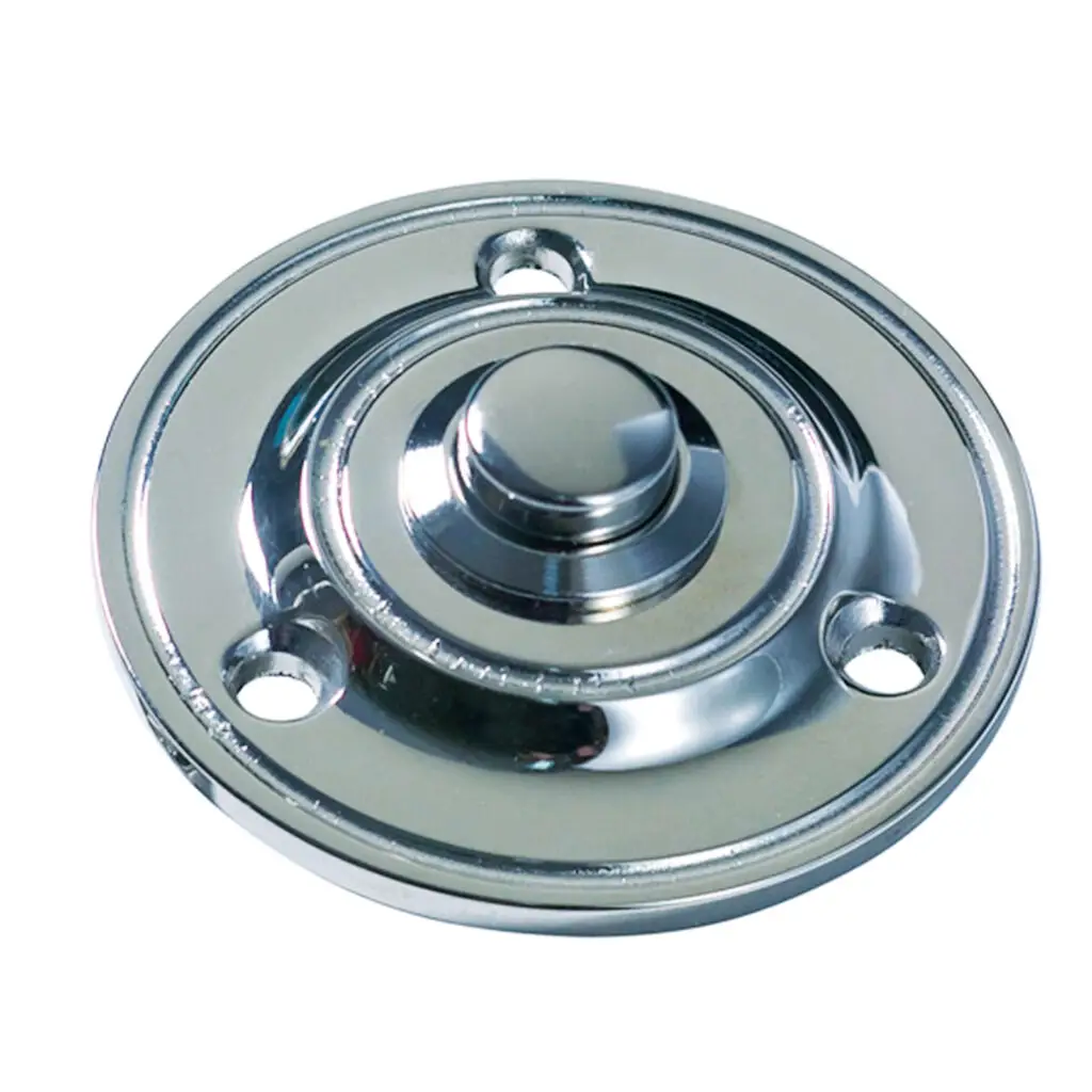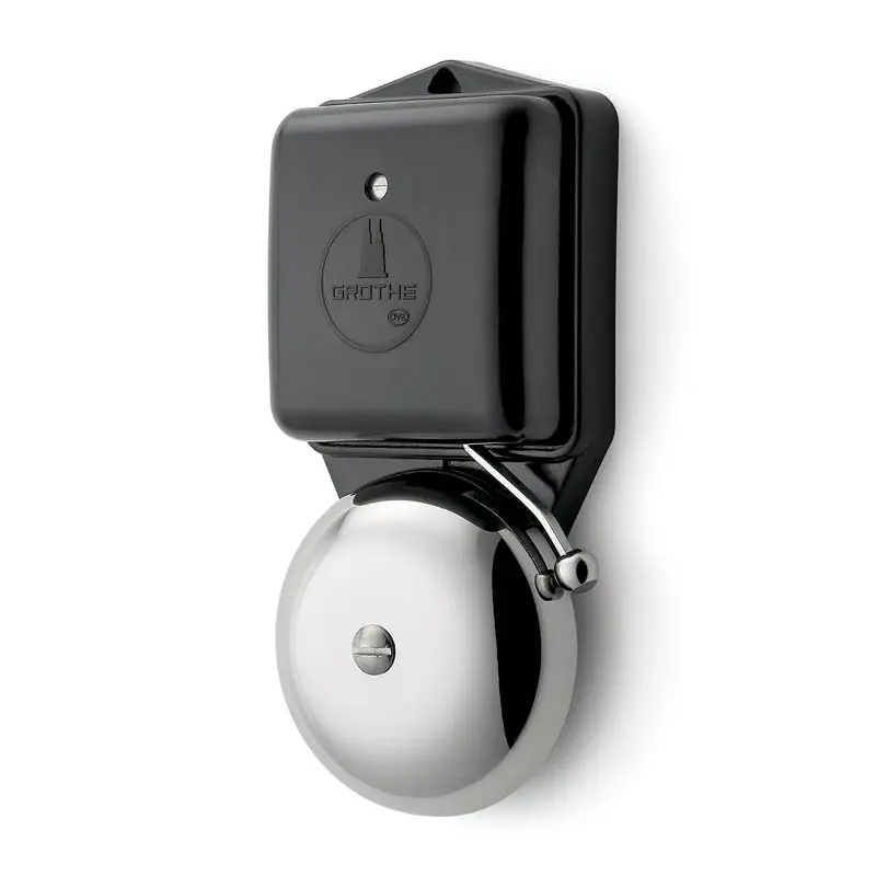 Dörringklocka av svart bakelit med förnicklad klocka i en modell som blev vanlig från 1930-talet och framåt. Ringer skarpt och med tidstypisk klang och är därför lämplig i hus och lägenheter från den tiden.