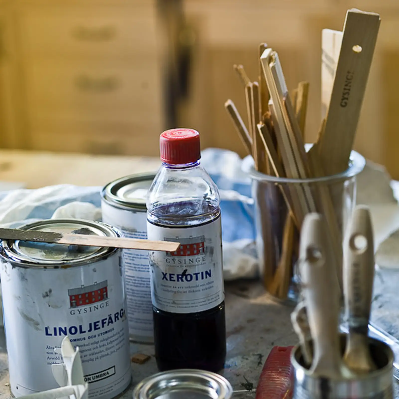 Stadig och stark rörsticka av hyvlad furu. Tillräckligt kraftig för att man skall våga »ta i« och röra om i färgburkar med kraftig bottensatts. Tillräckligt lång för att passa till burkar från två deciliter till tre liter. Borrat upphängningshål så att man kan torka och återbruka stickan.