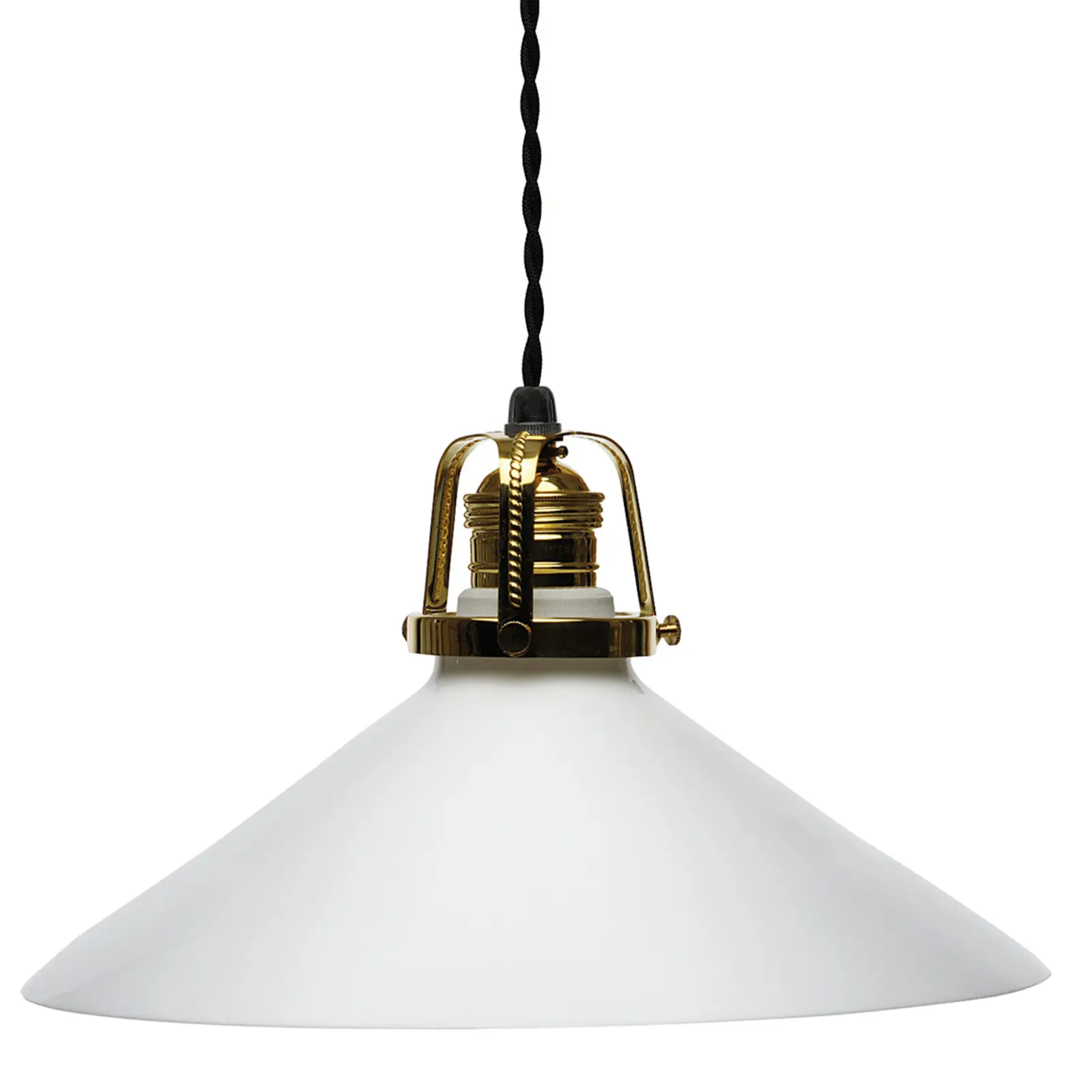 Gedigen kloformig skärmhållare av mässing, dekorerad med repstav och försedd med tre ställbara skruvar för att hålla fast skärmen.