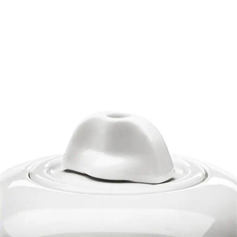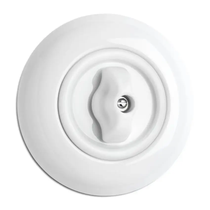 Strömbrytare av infälld modell i vitt porslin med vred som säger »klick« när man knäpper av och på. Snarlik flera av de svenska modeller som fanns från 1920-talet fram till 1950-talet. Mycket hög kvalitet i material- och form. Standardutförande i övriga detaljer, dvs passar i både gamla och nya infällda dosor.