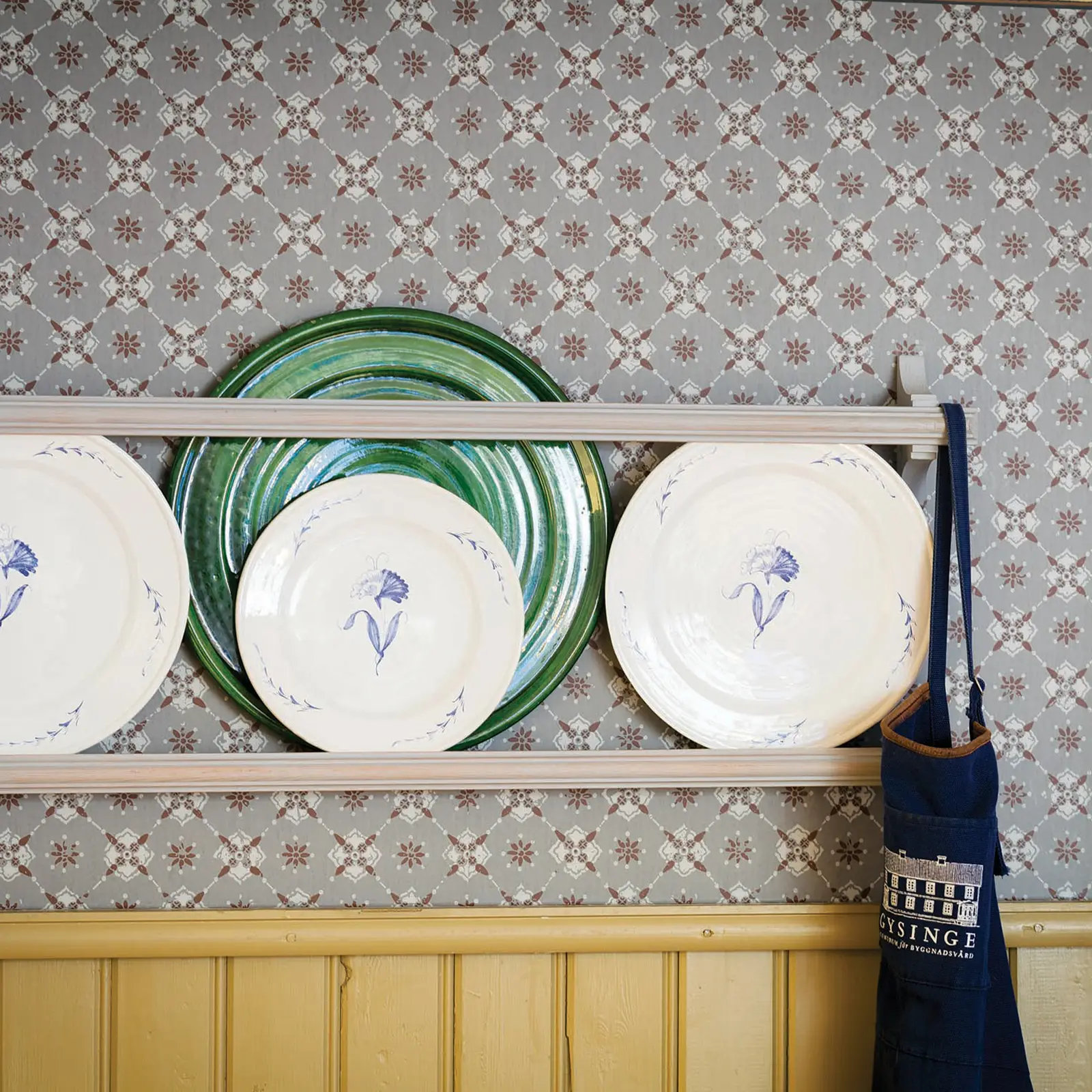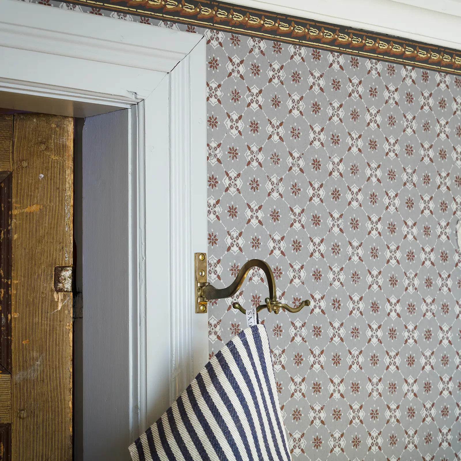 Tidstypisk tapet från slutet av 1800-talet i dov blå ton med beige botten. Tapeten är en återskapning från ett gammalt tapetfragment med okänt ursprung. Det enkla men detaljrika rutmönstret passar både i äldre hus och i en mer modern miljö. Tapeten finns även i mild grön kulör med beige botten.