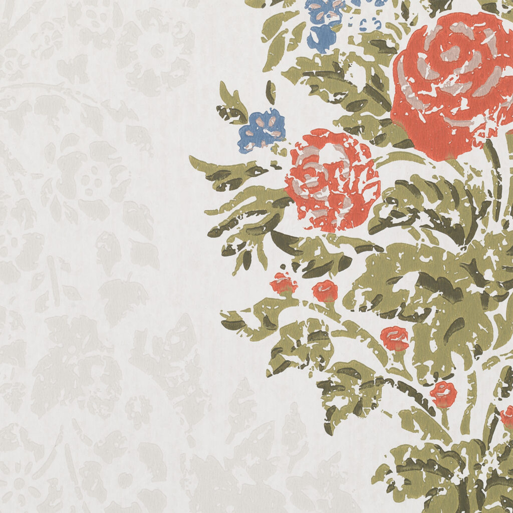Gården Lars-Daniels i Järvsö, är en typisk hälsingegård från 1800-talets första hälft; två våningar, timmer, rödfärgad, många fönster med gröna handblåsta glasrutor, dekorerad brokvist… Huvudbyggnaden har till stora delar stått orörd sedan den byggdes. Genom att den under 1900-talet mest använts som mobiliseringslager för militären har det heller inte funnits någon anledning att renovera den. ”Storkammaren” är ett av de mest välbevarade rummen i huset och därifrån kommer denna schablontapet. Tiden är runt 1840. Tapeten är på allmogevis en stilblandning; Först ett av 1700-talets favoritmönster – glest spridda blombukter mot enfärgad bakgrund, men här kombinerat med ett skirt, spetsliknande medaljongmönster av den typ som kom med nyrokokon först hundra år senare. Det är det här som är så intressant med allmogens inredningskonst, ofta ogenerade stilkombinationer, ofta ”extra allt” men som slutprodukt ändå varken vulgärt eller smaklöst. Den balansgången var allmogemålarna mästare på. Ett annat säkert stilgrepp är att schablontapeterna oftast kombineras med en lugn, enfärgad bröstpanel upp till fönsterhöjd, så att rummet, trots stormönstrade tapeter, ändå blev lugnt och välproportionerat.Originaltapeten är målad med limfärg på lumppapper och har varit övertapetserad flera gånger, varför många av de finaste detaljerna i spetsmönstret gått förlorade med tiden. Vid nytryckningen av tapeten har vi varit rädda om just denna patina och valt att inte rekonstruera mönstret till perfektion. Själen i Gysinges tapeter sitter ju överlag i att de just inte är så perfekta.