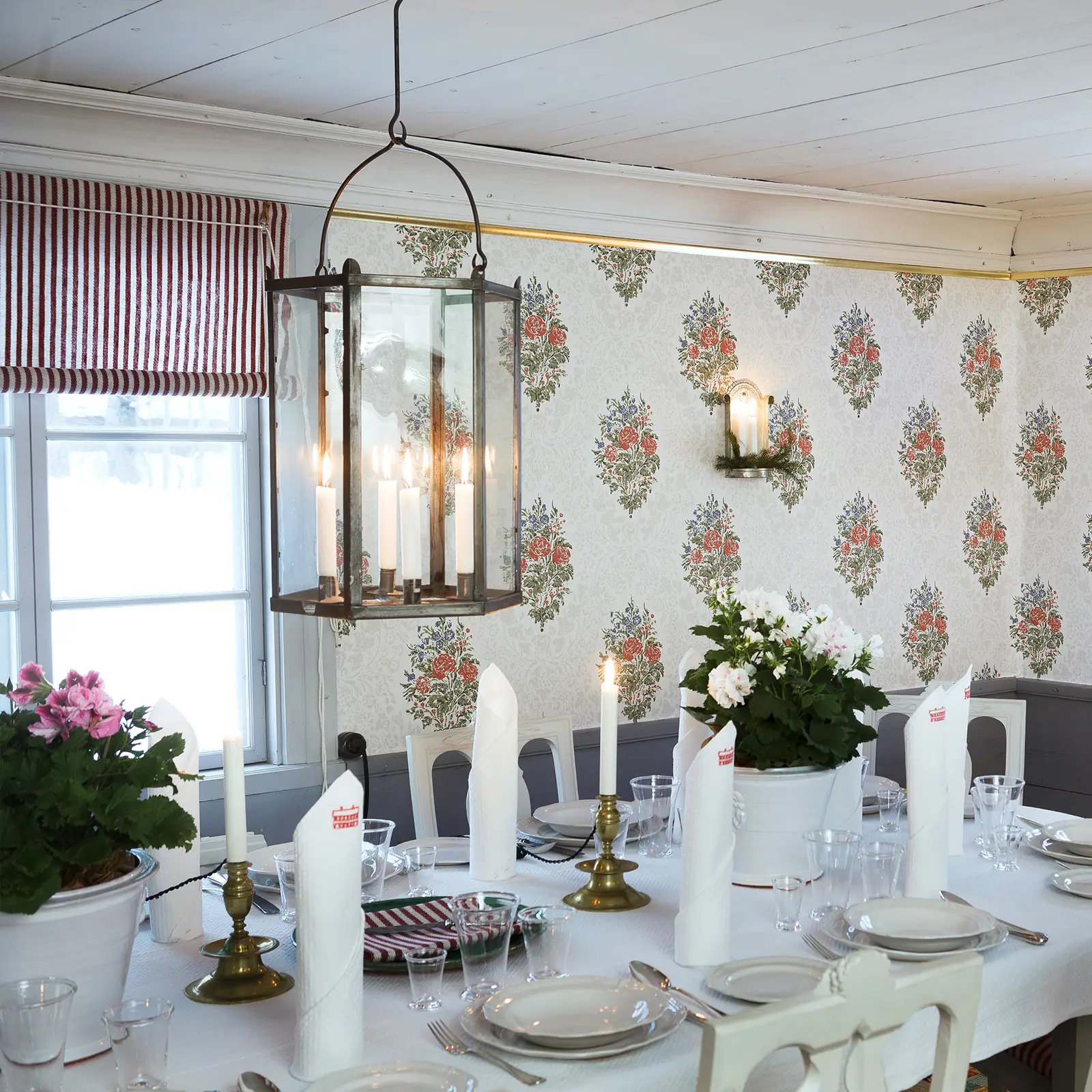 Gården Lars-Daniels i Järvsö, är en typisk hälsingegård från 1800-talets första hälft; två våningar, timmer, rödfärgad, många fönster med gröna handblåsta glasrutor, dekorerad brokvist… Huvudbyggnaden har till stora delar stått orörd sedan den byggdes. Genom att den under 1900-talet mest använts som mobiliseringslager för militären har det heller inte funnits någon anledning att renovera den. ”Storkammaren” är ett av de mest välbevarade rummen i huset och därifrån kommer denna schablontapet. Tiden är runt 1840. Tapeten är på allmogevis en stilblandning; Först ett av 1700-talets favoritmönster – glest spridda blombukter mot enfärgad bakgrund, men här kombinerat med ett skirt, spetsliknande medaljongmönster av den typ som kom med nyrokokon först hundra år senare. Det är det här som är så intressant med allmogens inredningskonst, ofta ogenerade stilkombinationer, ofta ”extra allt” men som slutprodukt ändå varken vulgärt eller smaklöst. Den balansgången var allmogemålarna mästare på. Ett annat säkert stilgrepp är att schablontapeterna oftast kombineras med en lugn, enfärgad bröstpanel upp till fönsterhöjd, så att rummet, trots stormönstrade tapeter, ändå blev lugnt och välproportionerat.Originaltapeten är målad med limfärg på lumppapper och har varit övertapetserad flera gånger, varför många av de finaste detaljerna i spetsmönstret gått förlorade med tiden. Vid nytryckningen av tapeten har vi varit rädda om just denna patina och valt att inte rekonstruera mönstret till perfektion. Själen i Gysinges tapeter sitter ju överlag i att de just inte är så perfekta.