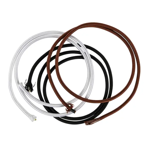 Svart textilkabel i gammeldags stil. Godkänd dubbelisolerad och 3-ledad (jordad). Silkesomspunnen, blank yta.