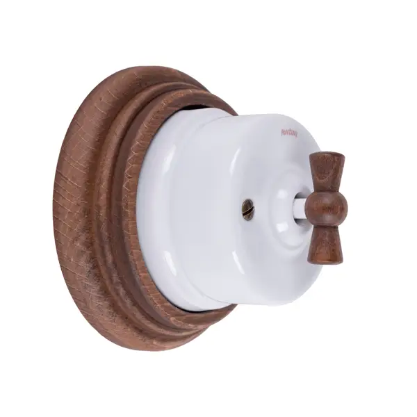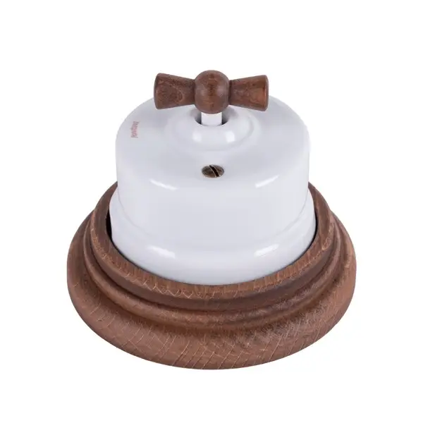 Utanpåliggande strömbrytare i vit porslin med vred och bottenplatta i mörkbetsat trä. Klassiskt utförande som var vanligt förekommande i Europa under 1900-talets första hälft.