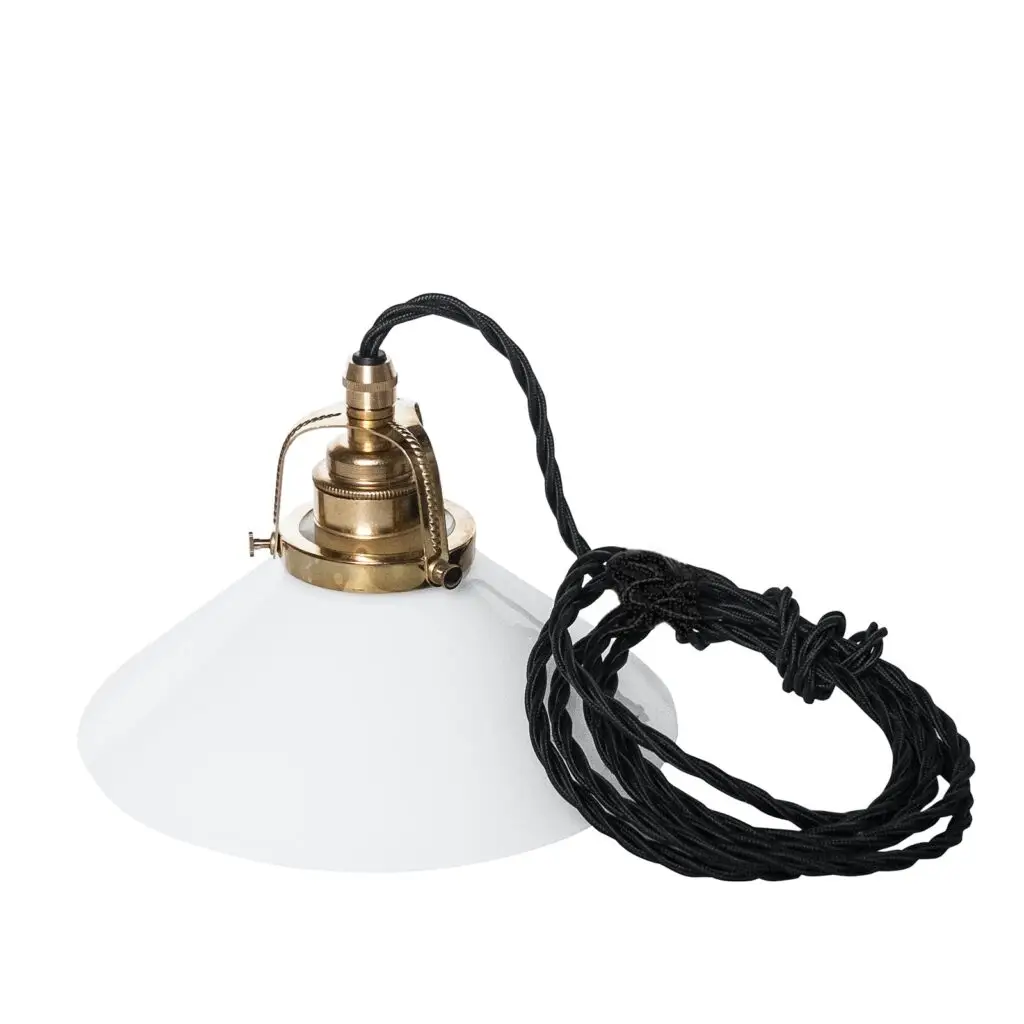 Skärm av opalglas, diameter 25 cm. Lamphållare obehandlad mässing. Tvinnad svart textilsladd 2 m ingår.  Stickpropp ingår ej.