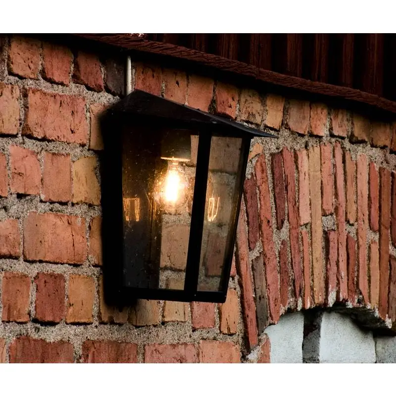 Utomhuslampa av koppar i traditionell lyktform. Metallen är obehandlad och mörknar därför med tiden. Glasad med handblåst glas, ca 3 mm tjockt. Oglasad botten gör det lätt att byta glödlampa. Även bakstycket är av kopparplåt.